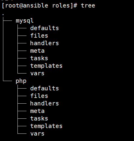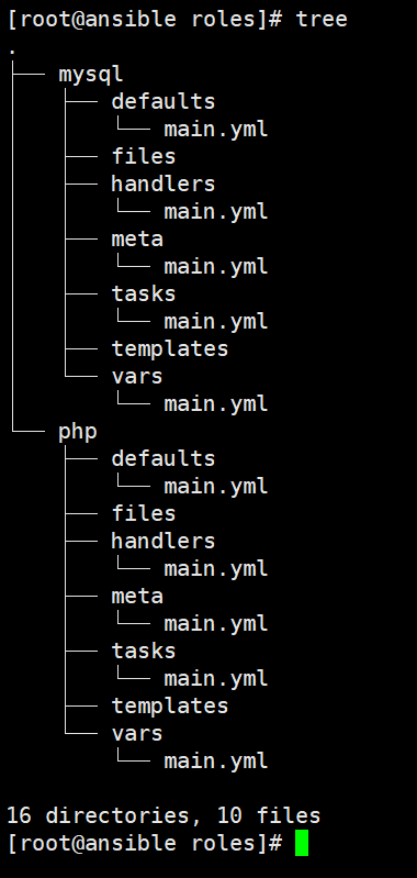 mkdir -p /etc/ansible/roles/mysql/{files,templates,tasks,handlers,vars,defaults,meta} ------------------在mysql目录下创建七大板块目录