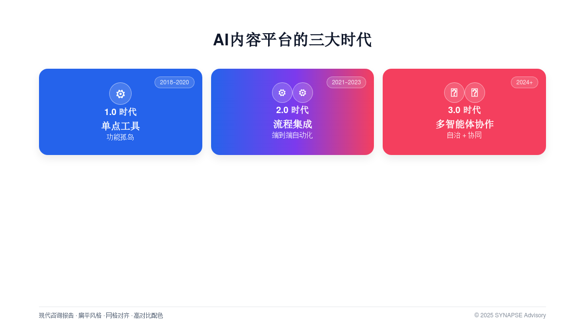 要理解当前AI内容平台的市场格局,我们必须先回顾其发展的三个关键时代。这不仅是一部技术进化史,更是一面能帮助企业辨别优劣、看清未来的镜子。