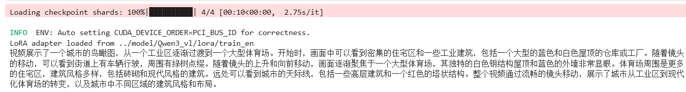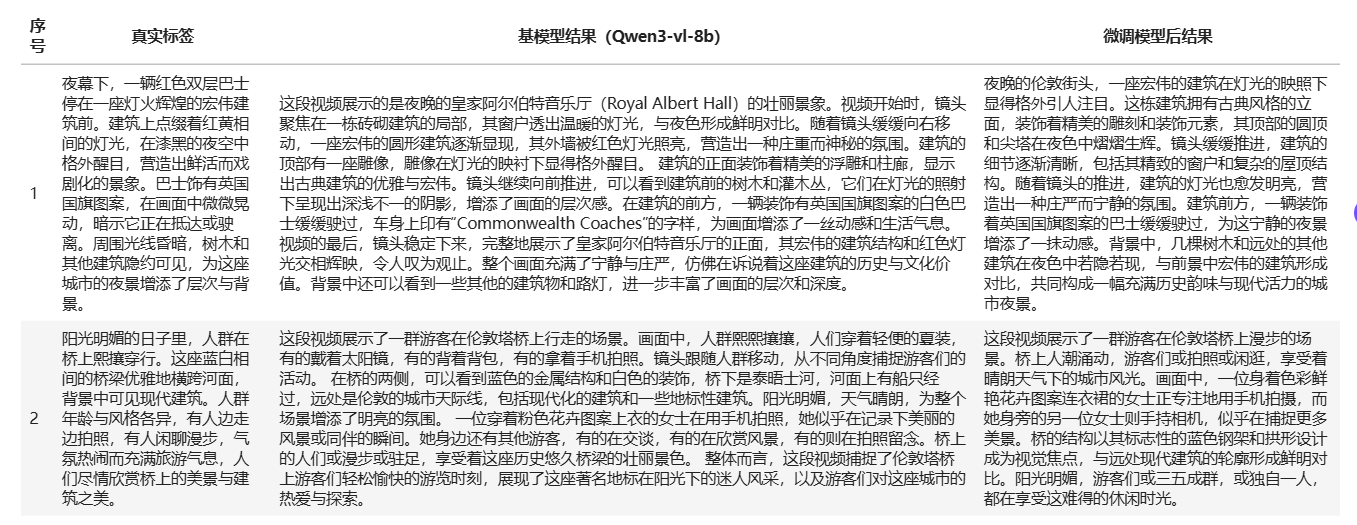 微调后的模型视频数据输出样本达到『场景正确 + 细节丰富 + 与真实标签语义一致』的可用标准,证明垂类微调已经成功把通用模型驯化成城市风光领域的专业描述员。