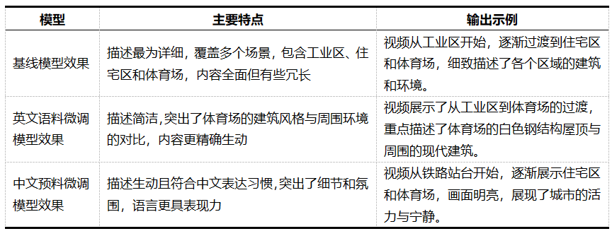 可以看出,基线模型提供了最为详细的场景描述,而英文微调模型则更加简洁且精准,中文微调模型则结合了中文表达习惯,提供了生动且富有氛围的描述。