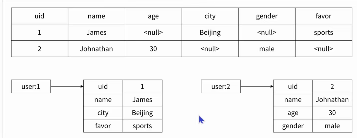 哈希类型是稀疏的,而关系型数据库是完全结构化的,例如哈希类型每个键可以有不同的 field,一张关系型数据库的字段你可以随机挑选设置嘛!而关系型数据库⼀旦添加新的列,所有行都要为其设置值,即使为 null,数据库你必须都得设置了。如图: