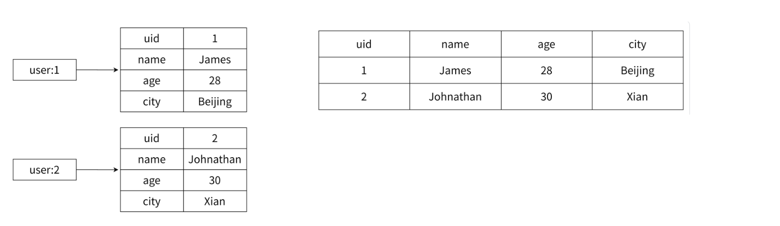 我们之前说,string类可以作为缓存来使用。而存储结构化的数据,比如关系型数据,使用hash更合适,假设我们有一张表保存用户信息。我们使用hash就可以这样存储: