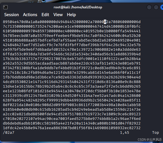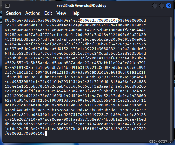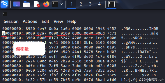 二、先进用xxd进入一次hex模式,查看偏移量地址,通过网上找到别人的解题答案发现图片宽和高的偏移量横坐标都为0x00000010,纵坐标偏移量从0到3就是宽,纵坐标偏移量从4到7就是高。