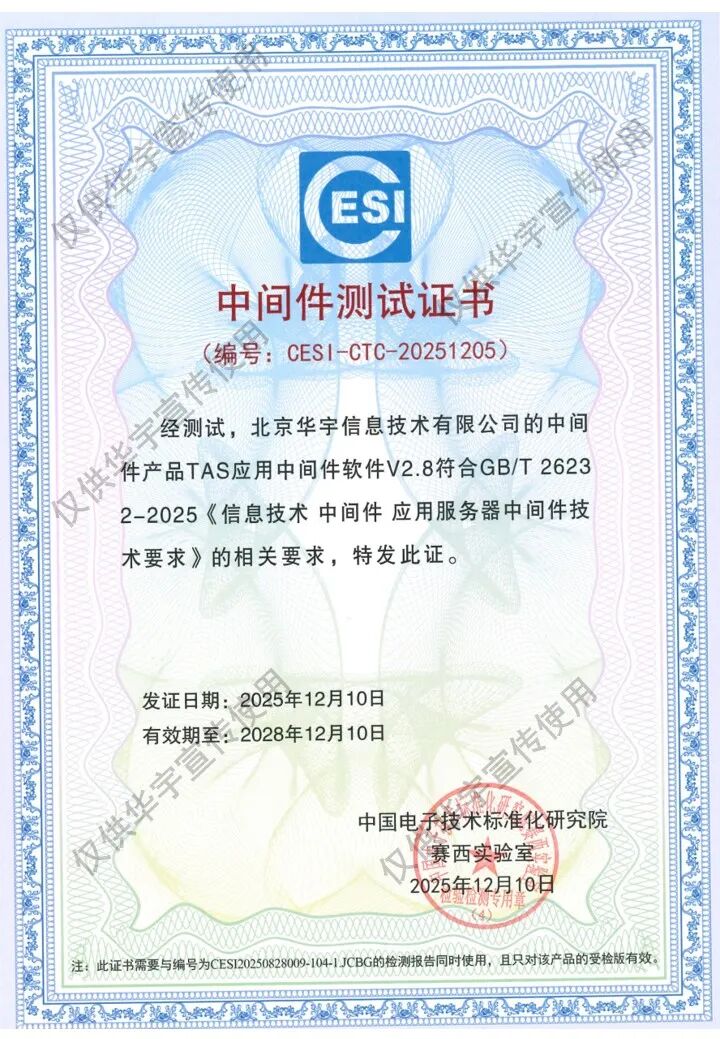 近日,华宇TAS应用中间件成功通过**GB/T 26232-2025《信息技术 中间件 应用服务器中间件技术要求》**国家标准测试,获得权威认证证书。该标准由国家市场监督管理总局、国家标准化管理委员会发布,于2025年11月1日正式实施,是衡量应用服务器中间件技术水平的权威标尺。本次认证的顺利通过,也标志着TAS应用中间件在自主可控、安全可靠领域迈出了重要的一步。