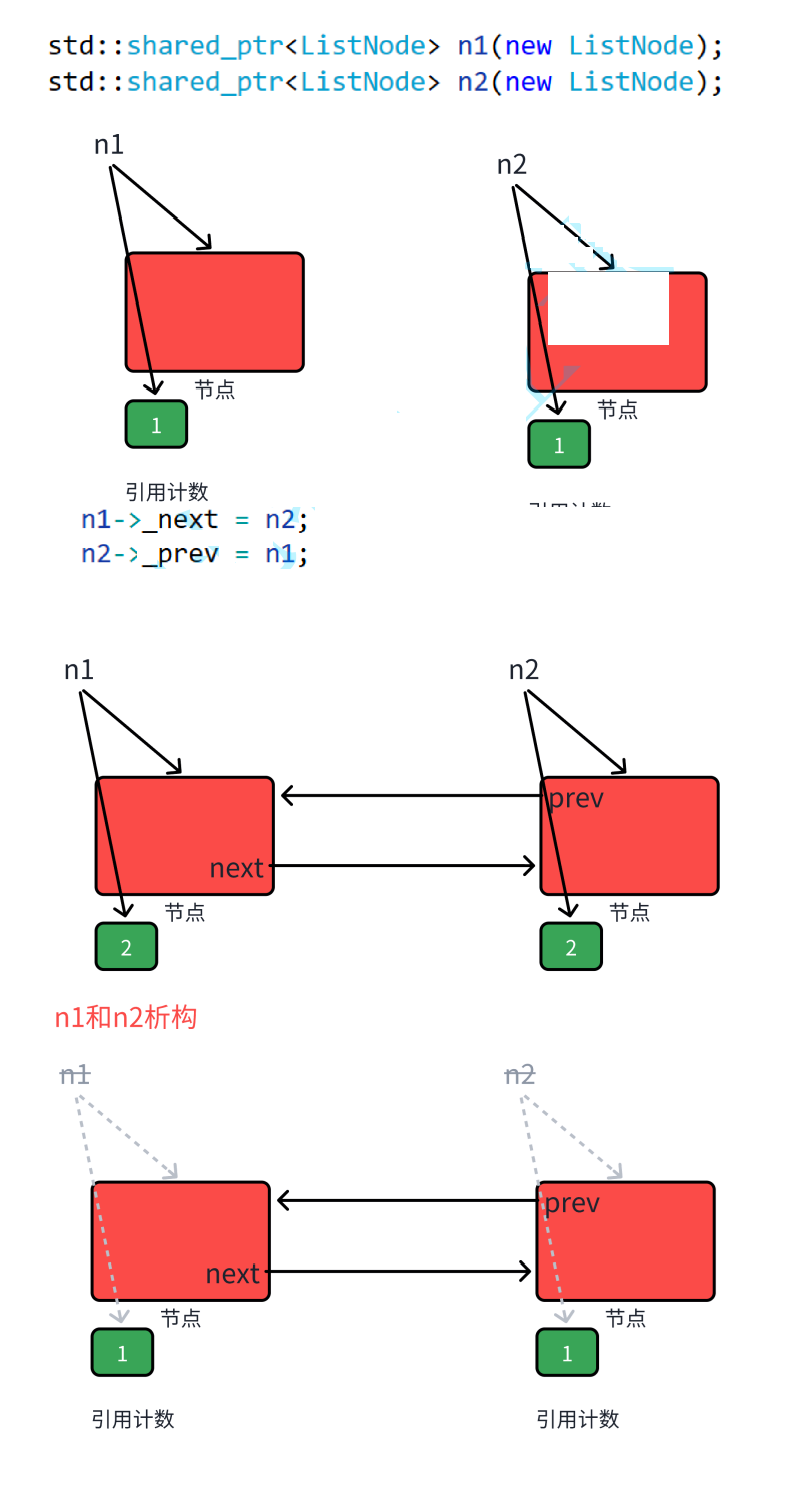 如下图所述场景,n1和n2析构后,管理两个节点的引⽤计数减到1