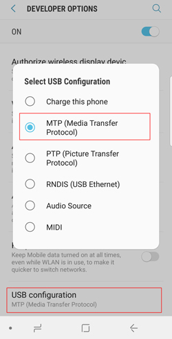 在 Pixel 上下拉通知面板,点击通知面板,然后在**"使用 USB 传输** 文件"窗口中选择**"传输文件 (MTP)"** 。