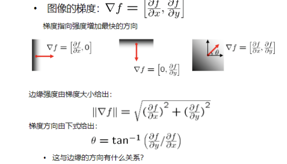 - 一阶导数(梯度): 边缘对应于一阶导数的极值点 ;梯度指向强度增加最快的方向。