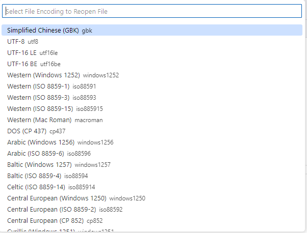 点击后会显示支持的文件编码方式,如下图所示,用户根据实际文件编码点击对应选项后,当前文件将以该编码方式重新加载:
