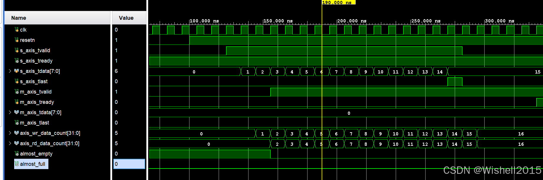 可以看到,s_axis_tready信号在 0 和 1 之间不断跳变。这意味着接收端一会儿说"我满了",一会儿说"我可以收"。人为制造总线拥塞(Backpressure)。这强迫上游的 FIFO 必须将数据存入内部 RAM,从而验证 FIFO 的缓存功能和满标志逻辑是否正常工作。