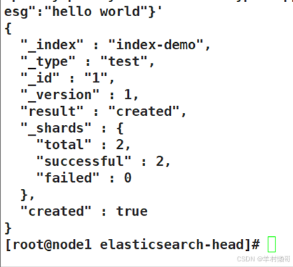 curl -XPUT 'localhost:9200/index-demo/test/1?pretty&pretty' -H 'Content-Type: application/json' -d '{"user":"zhangsan","mesg":"hello world"}'