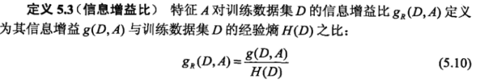 4、计算每个属性的信息增益比(gain ratio = Gi / Hi),即信息增益与类别自身熵的比值。