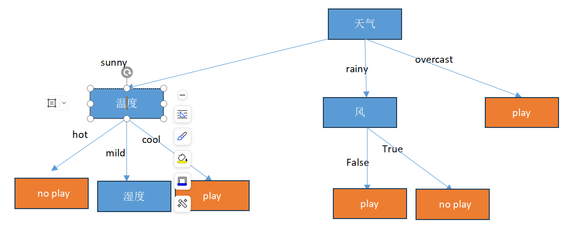 显然,信息增益最大的是: 天气 > 湿度 > 有风 > 温度