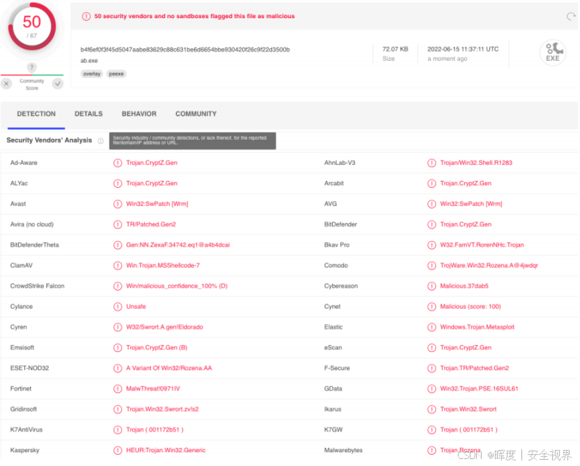 | 实践目的 | 通过案例,展示如何利用 VirusTotal 平台 快速评估各类杀毒软件对特定恶意载荷的检出能力。 |