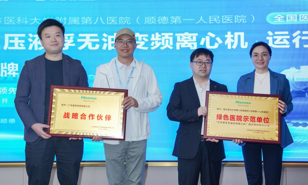 活动中,海信日立向院方授予"绿色医院示范单位"牌匾,向塞安科技授予"战略合作伙伴"荣誉,标志着三方在绿色医院建设中的深度协同。随后,嘉宾们共同揭幕,象征全国医疗系统首台正压液浮无油变频离心机正式投入运行。