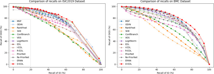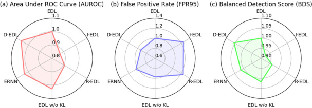 图6. ISIC2019数据集上基于EDL方法的OOD检测比较。所有指标均相对于基线EDL进行了归一化。