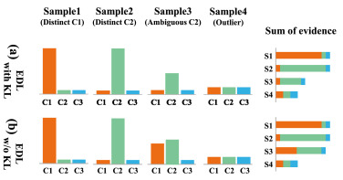 图4. 不同样本在 (a) 带有KL的EDL 和 (b) 不带KL的EDL 中的证据估计图。