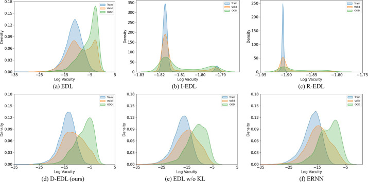 图7. ISIC2019数据集中不同模型在训练数据(蓝色)、有效数据(红色)和OOD数据(绿色)上导出的空位分布比较。为了更直观地呈现,显示时使用了对数尺度的转换值。对于旨在进行OOD检测的理想证据神经网络,训练数据上的空位分布应尽可能接近有效数据上的分布,并尽可能不同于OOD数据上的空位分布。