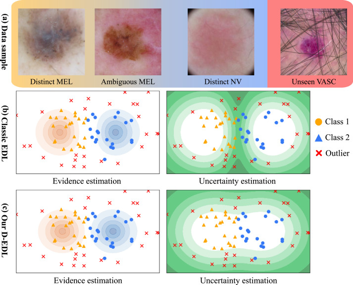 图1. EDL和本文提出的D-EDL在医学OOD检测中的概述。(a) 是真实医学数据集中的代表性医学图像,展示了OOD检测中ID类别之间模糊性的挑战。(b) 和 (c) 是经典EDL和D-EDL在处理OOD检测中模糊ID样本时的示意图。左侧面板显示证据估计,右侧面板说明不确定性估计。颜色越深表示值越高。对于位于类别簇之间的模糊样本,我们的D-EDL方法在测量证据和不确定性方面表现出卓越的能力,从而实现了改进的OOD检测性能。