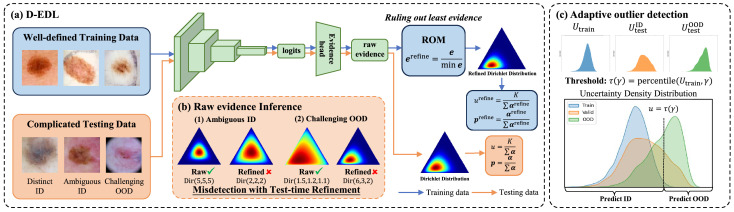图2. 所提出方法的概述。(a) 展示了D-EDL。在训练中,ID数据的证据在ROM中被重新形成以满足差异化限制。对于包括ID和OOD在内的复杂测试数据,直接利用原始证据生成不确定性以避免(b)中所示的错误检测。(c) 表示临床应用中自适应异常值检测的过程。γ是自定义敏感度,τ是自适应阈值。不确定性值大于τ的测试样本被识别为异常值,否则被预测为ID。