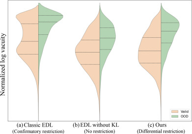 深度学习在医学图像分析中取得了显著进展,但现实世界的临床数据常因疾病流行率差异导致分布外(OOD)样本的出现。当遇到这些未见过的OOD图像时,神经网络容易以过高的置信度将其错误分类为已知分布内(ID)类别,显著增加误诊风险。因此,模型自动标记无法可靠分析且需人工干预的输入至关重要。现有OOD检测方法主要分为三类:基于辅助异常值的方法(不切实际)、基于扰动的方法(对医学图像效果差)和基于不确定性估计的方法。证据深度学习(EDL)因其在性能、效率和可扩展性方面的优势而备受关注。然而,EDL存在过度惩罚问题,即对具有高数据不确定性的样本过度约束证据,导致不确定性高估并将ID样本误分类为OOD。本研究揭示了KL散度正则化在经典EDL中造成过度惩罚效应,使得具有高数据不确定性的ID样本被误判为异常值,从而影响OOD检测性能。针对此问题,本文提出了差异化证据深度学习(D-EDL),通过引入差异化限制和排除模块(ROM)来有效建模模糊性,并在测试时采用原始证据推理(RI)以提高鲁SD和准确性,同时提出了平衡检测分数(BDS)以严格评估临床OOD检测性能。