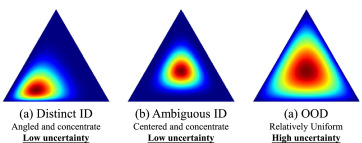 图3. 针对不同ID(清晰)、模糊ID和OOD测试样本的Dirichlet分布单纯形。