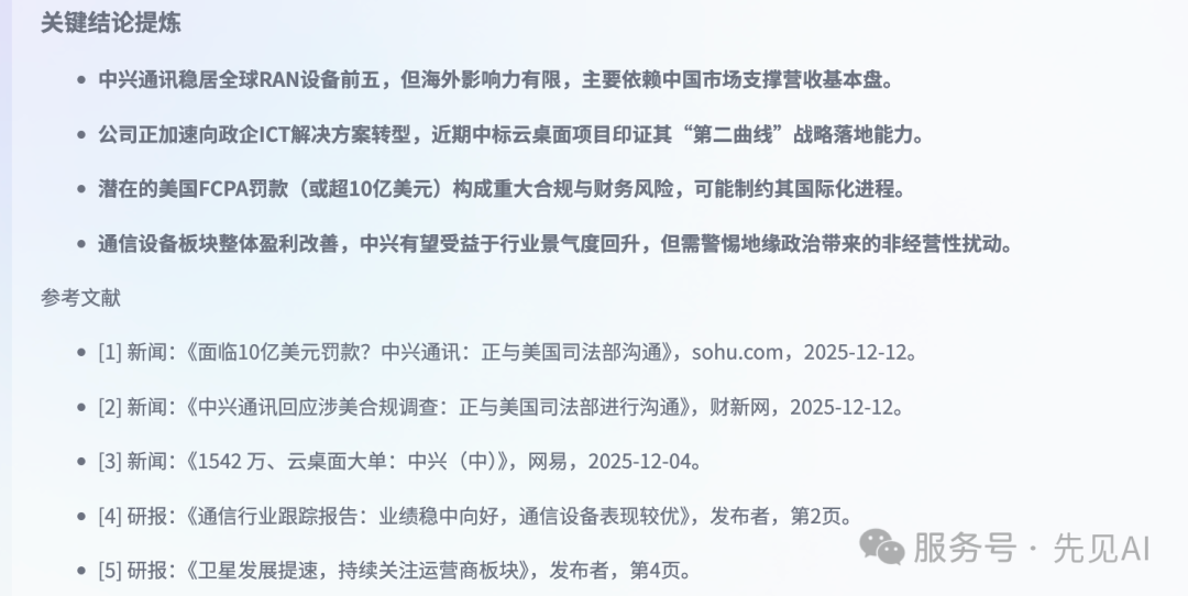 输入目标企业名称(如"中兴通讯")后,系统通过多源检索引擎自动聚合头部券商研报、企业财报解读及通信行业垂直白皮书,基于TAI可信分析体系对多源信息进行交叉验证。无需手动筛选冗余内容,即可输出结构化核心结论,所有观点与量化数据均标注原始来源与逻辑链路,确保可追溯、可验证,完美匹配企业分析的专业需求。