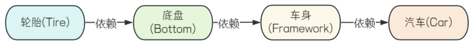我们想要建造一辆车,需要先建造一个车身,建造车身需要先建造底盘,建造底盘需要先建造轮胎,这是传统的代码模式。