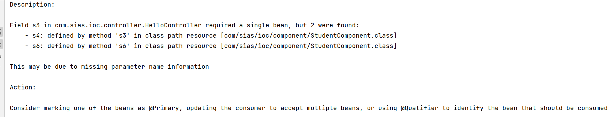 如果我们修改StudentComponent类的代码,此时再进行依赖注入就会报错,因为此时容器里面有两个Student类型的对象,此时就不知道注入那个。