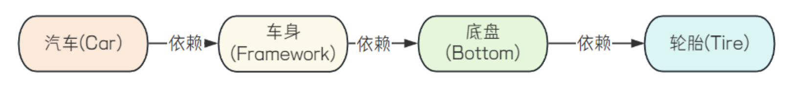 此时我们就可以换一种思路,不再是汽车依赖车身,车身依赖底盘,底盘依赖轮胎,而是反过来操作: