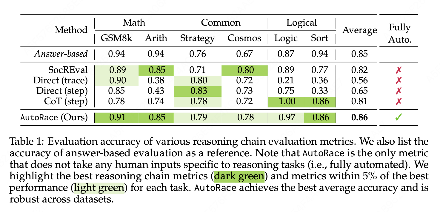 | AutoRace | 自动创建评估标准并应用。 | 完全自动化,无需人工标注。 | 对复杂任务的适应性需要进一步验证。 | 多种推理任务,尤其是需要快速部署的场景。 |