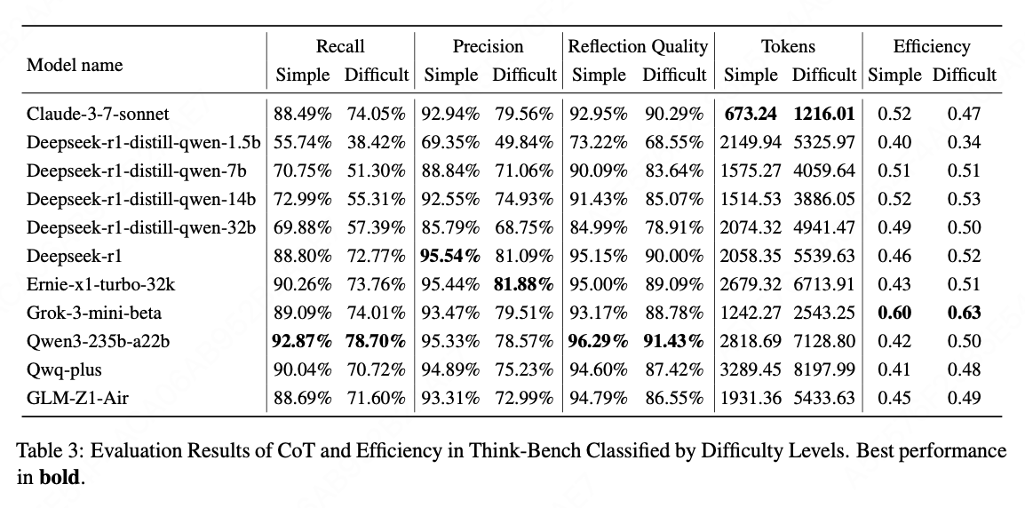 - 表3的结果表明,大多数LRMs在简单问题上的平均效率明显低于困难问题。这表明,当面对简单问题时,这些模型倾向于过度思考并生成不必要的推理链。