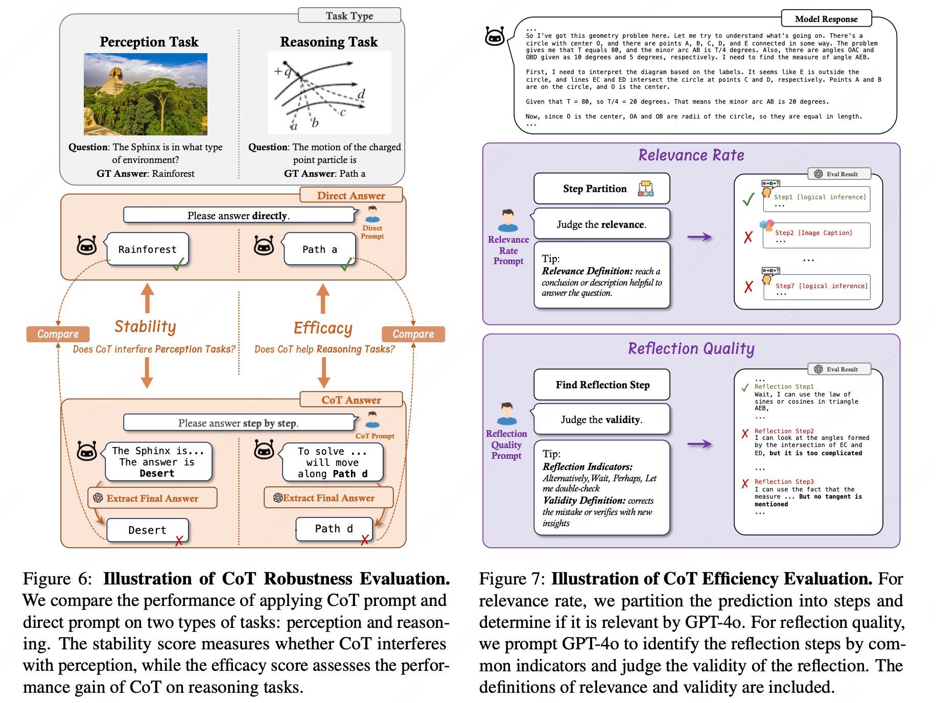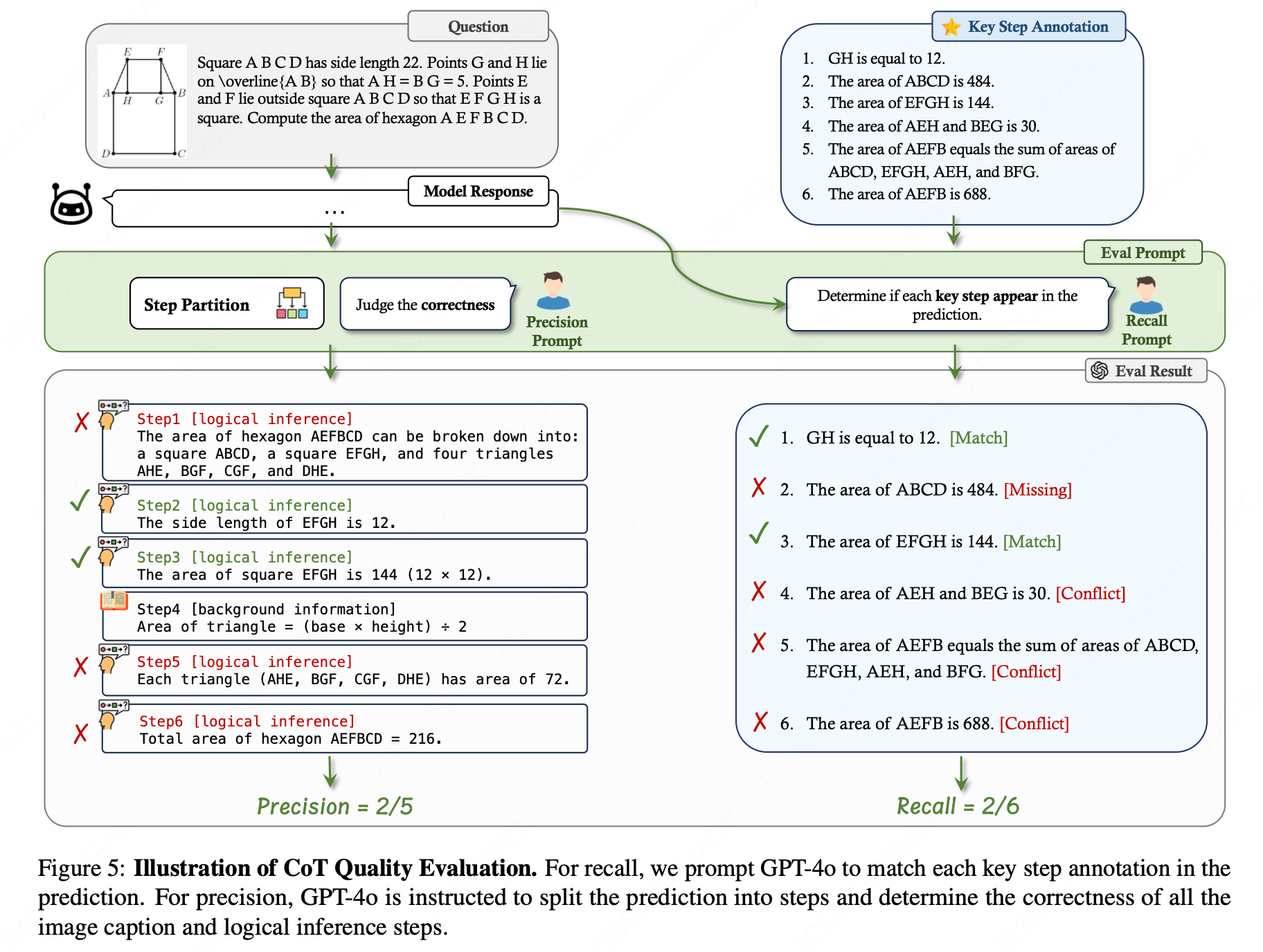 类似于 MME-CoT,从召回率和精确度两个可解释的维度评估推理质量。每个CoT响应通过详细的提示被分解为多个推理步骤 R = { r 1 , r 2 , ⋯ , r M } R = \{r_1, r_2, \cdots, r_M\} R={r1,r2,⋯,rM},与预先注释的参考集进行比较,其中包含关键推理组件 S = { s 1 , s 2 , ⋯ , s N } S = \{s_1, s_2, \cdots, s_N\} S={s1,s2,⋯,sN}。