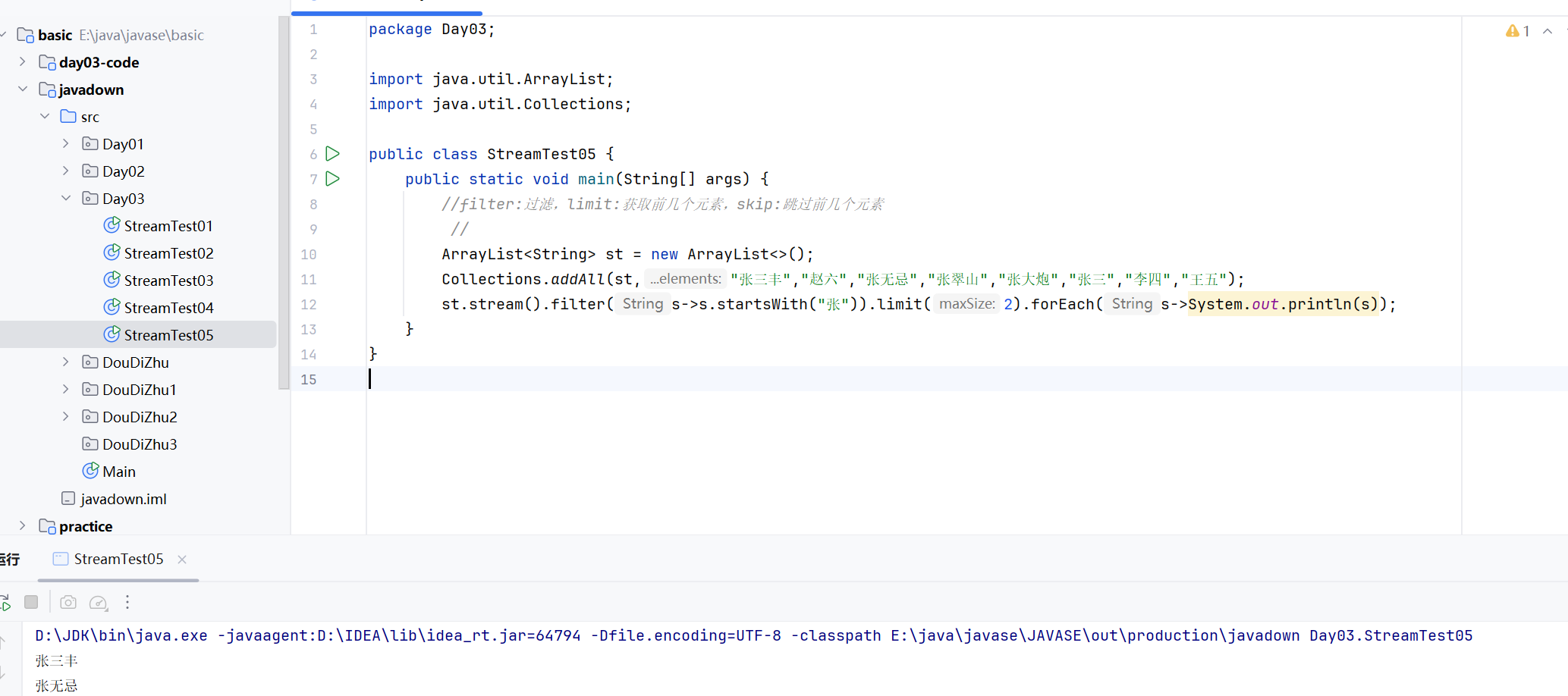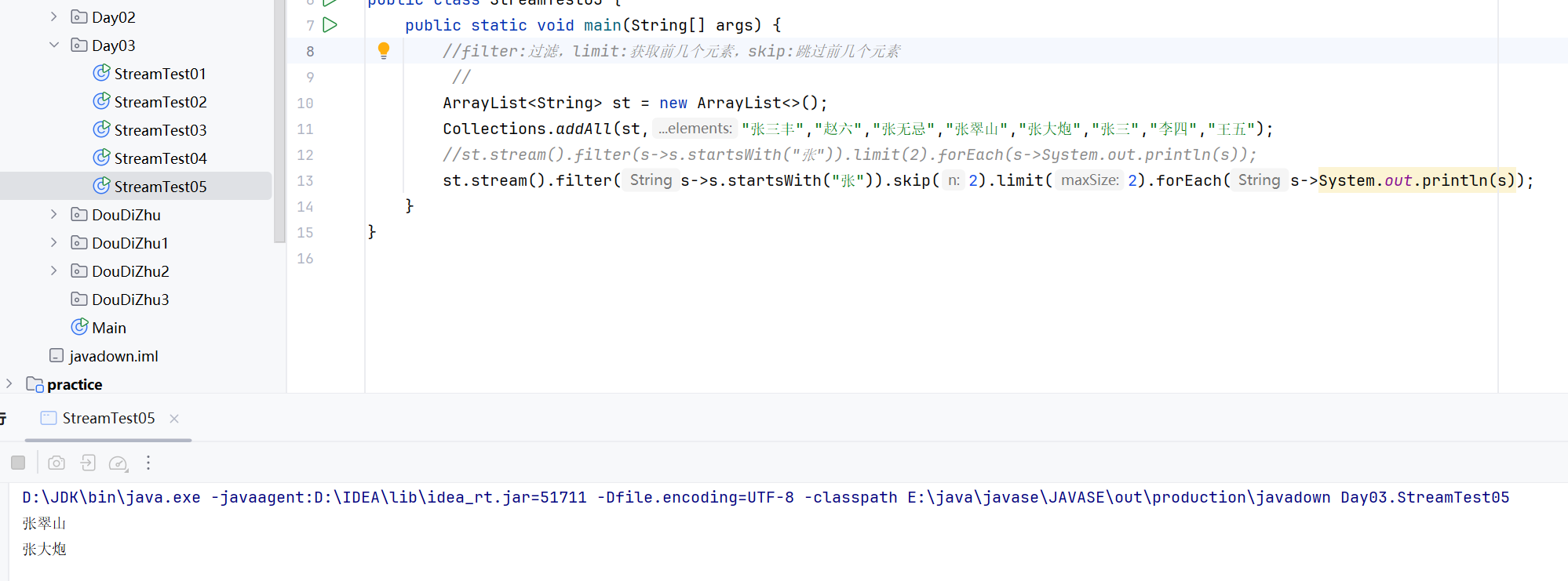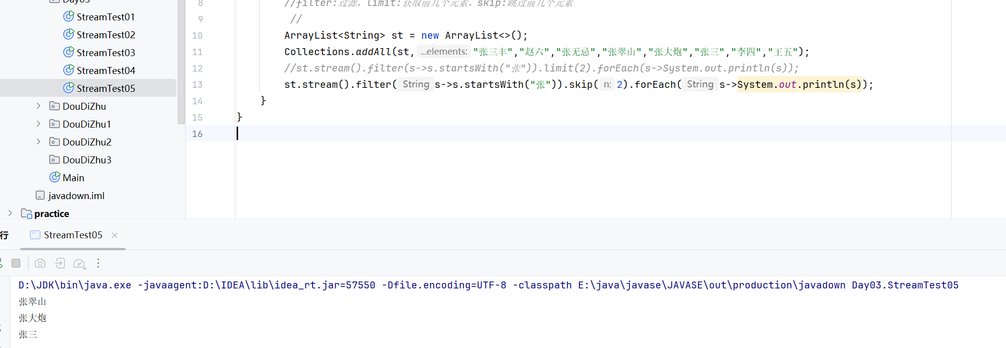 list.stream().filter(a->a.charAt(0)=='张').filter(b->b.length()==3).forEach(c-> System.out.println(c));