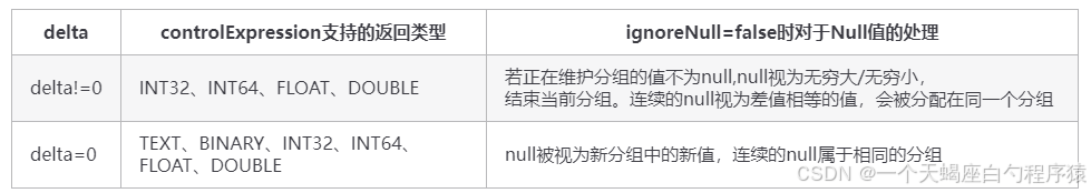 在delta取不同值时,controlExpression支持的返回数据类型以及当ignoreNull为false时对于null值的处理方式可以见下表: