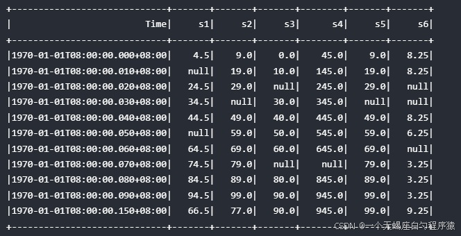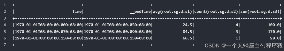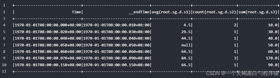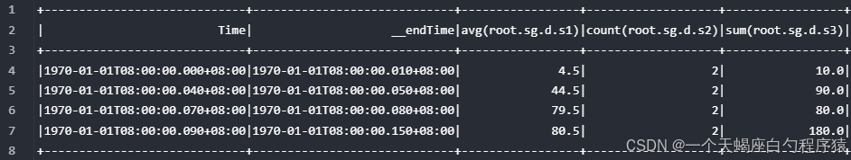 得到如下结果,其中由于第二个1970-01-01T08:00:00.006+08:00到1970-01-01T08:00:00.010+08:00的窗口中包含四个点,不符合size = 5的条件,因此不被输出