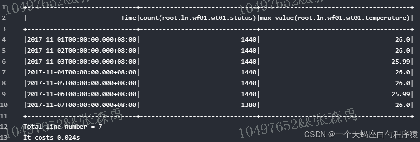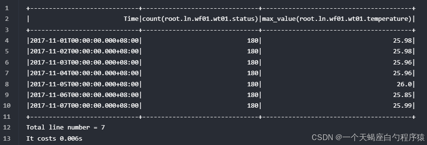 select count(status), max_value(temperature) from root.ln.wf01.wt01 group by ([2017-11-01T00:00:00, 2017-11-07T23:00:00),1d);