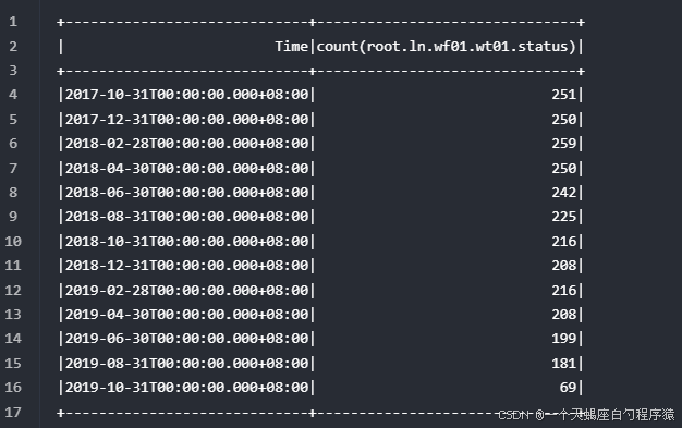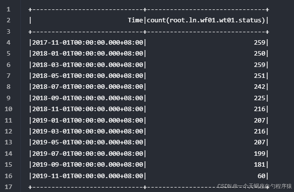 select count(status) from root.ln.wf01.wt01 group by([2017-10-31T00:00:00, 2019-11-07T23:00:00), 1mo, 2mo);