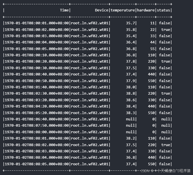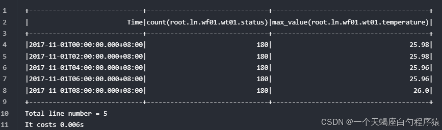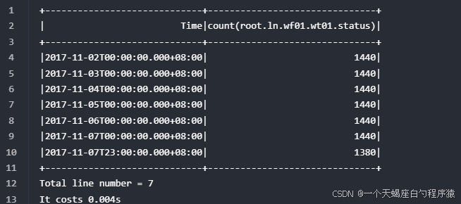 | Time| __endTime|count(root.ln.wf02.wt01.temperature)|count(root.ln.wf02.wt01.hardware)|count(root.ln.wf02.wt01.status)|