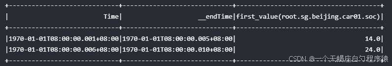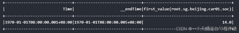| Time|max_time(root.sg.beijing.car01.charging_status)|count(root.sg.beijing.car01.vehicle_status)|last_value(root.sg.beijing.car01.soc)|