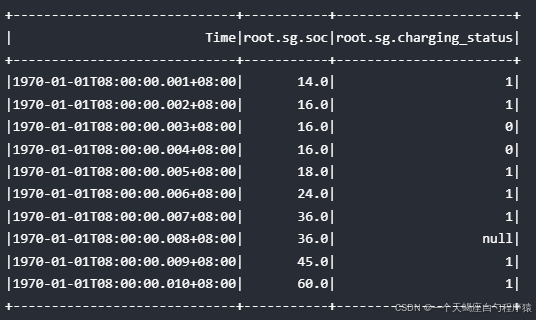 | Time|root.sg.beijing.car01.soc|root.sg.beijing.car01.charging_status|root.sg.beijing.car01.vehicle_status|