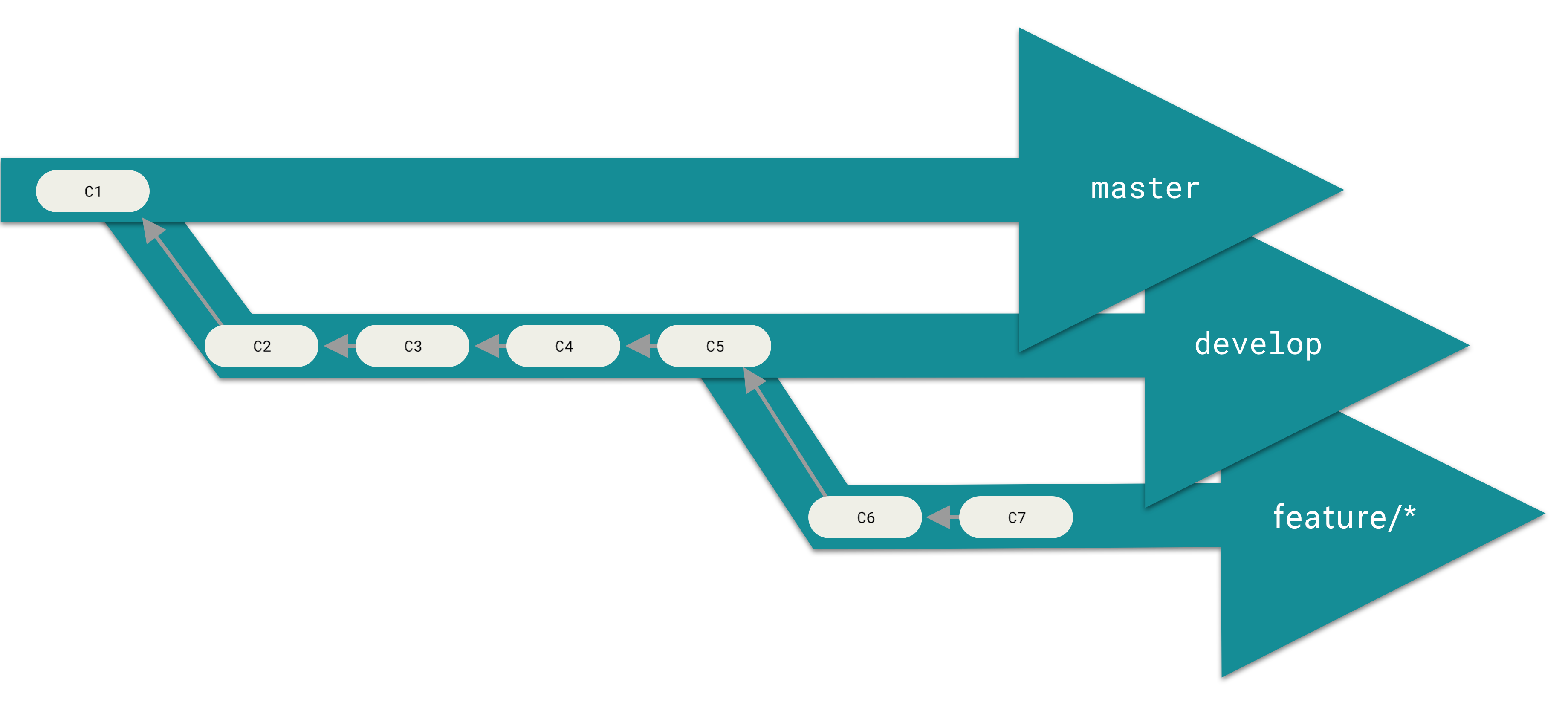由以上的分支模型角色不难看出:稳定分支在提交历史中靠下,而最前沿的分支则在历史中靠上,它们呈现出一种渐进式的关系。