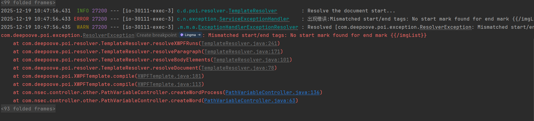 com.deepoove.poi.exception.ResolverException: Mismatched start/end tags: No start mark found for end mark {{/imgList}}