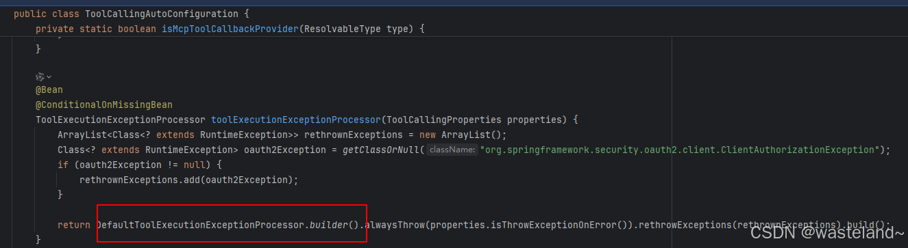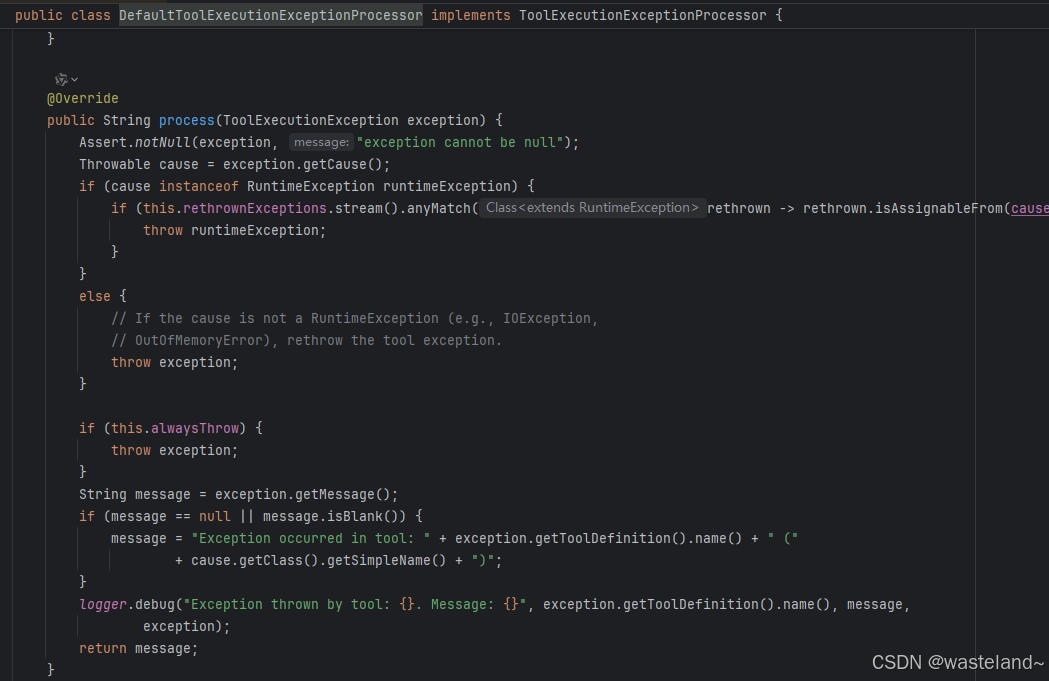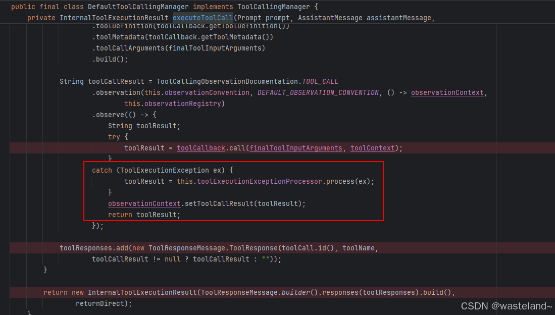 ToolExecutionExceptionProcessor 由默认的 ToolCallingManager(DefaultToolCallingManager)内部使用,用于在工具执行期间处理异常。