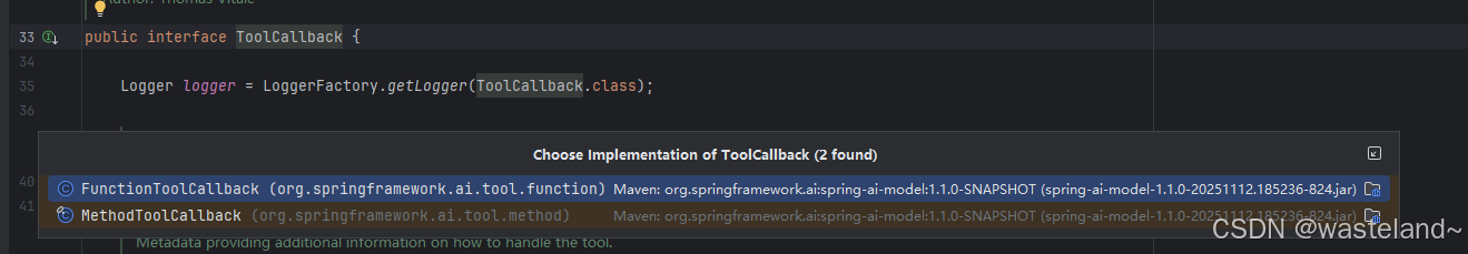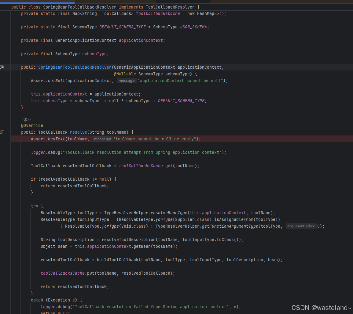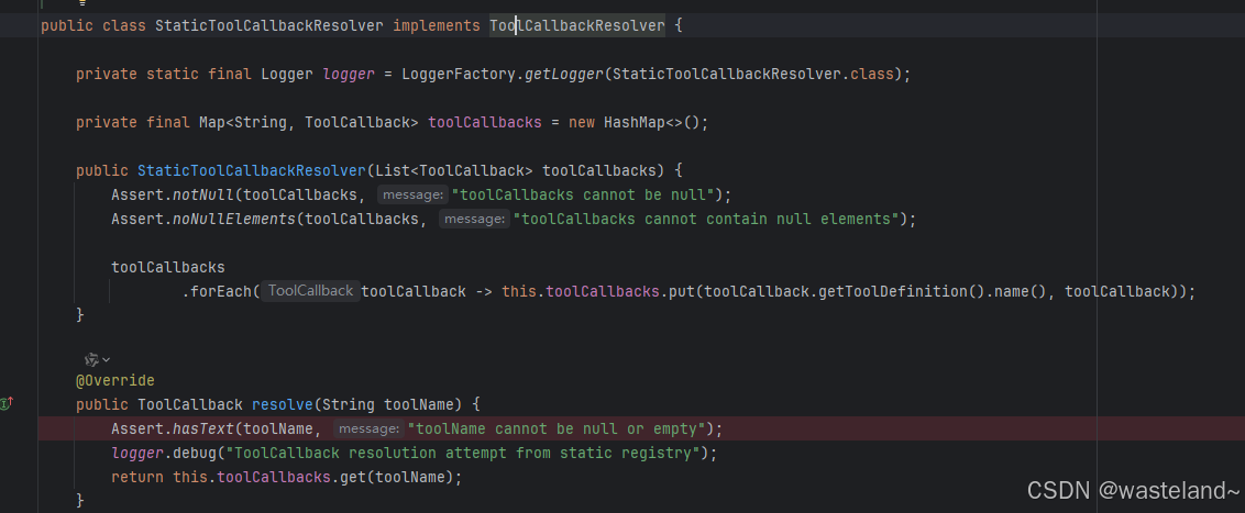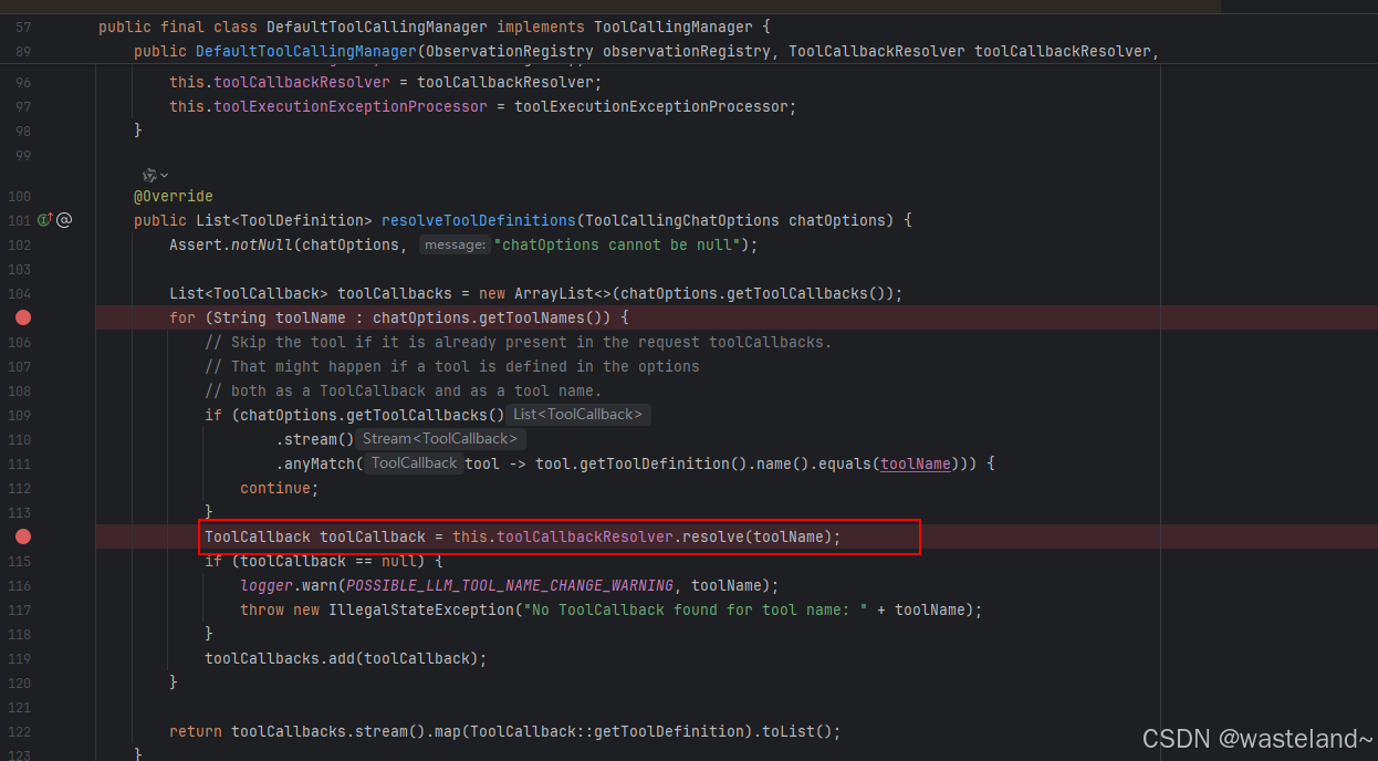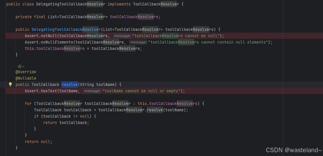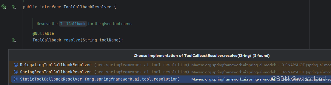 默认情况下,Spring AI 依赖于一个 DelegatingToolCallbackResolver,它将工具解析委托给一个 ToolCallbackResolver 实例列表:SpringBeanToolCallbackResolver 和StaticToolCallbackResolver,它执行的时候会循环遍历这个列表,依次执行对应的resolve方法。
