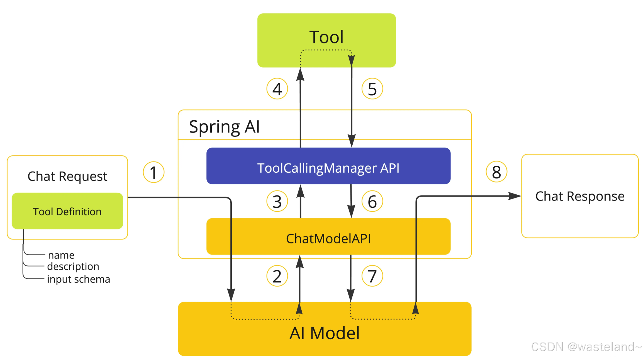③ ChatModel 将工具调用请求发送至 ToolCallingManager API。