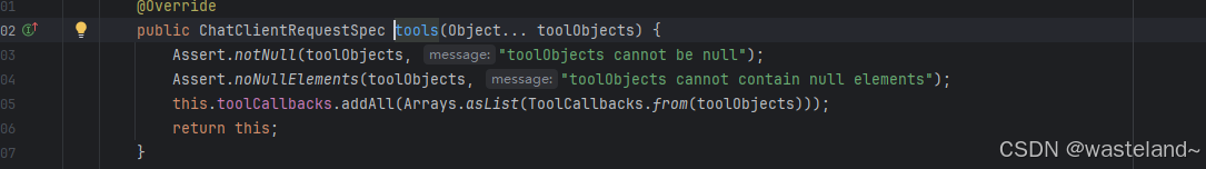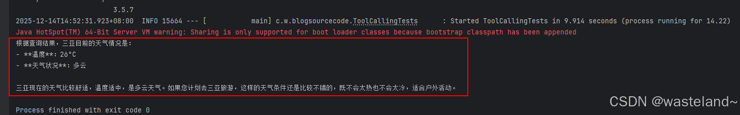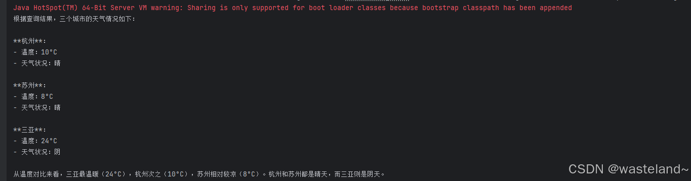 注意:通过上面案例我们能发现一个问题,就是我们最好是给工具调用的方法入参一个清晰的定义,以便大模型能够给出正确的参数格式。这样不仅可以提高模型回答用户问题的准确度,还能减少因工具调用失败而多次调用大模型的次数,提高响应时间,降低成本。