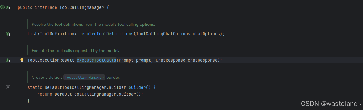 ToolCallingManager 负责管理工具执行生命周期,它负责处理与工具关联的 returnDirect 属性。如果该属性设置为 true,则工具调用的结果将直接返回给调用者。否则,结果将发送回模型。