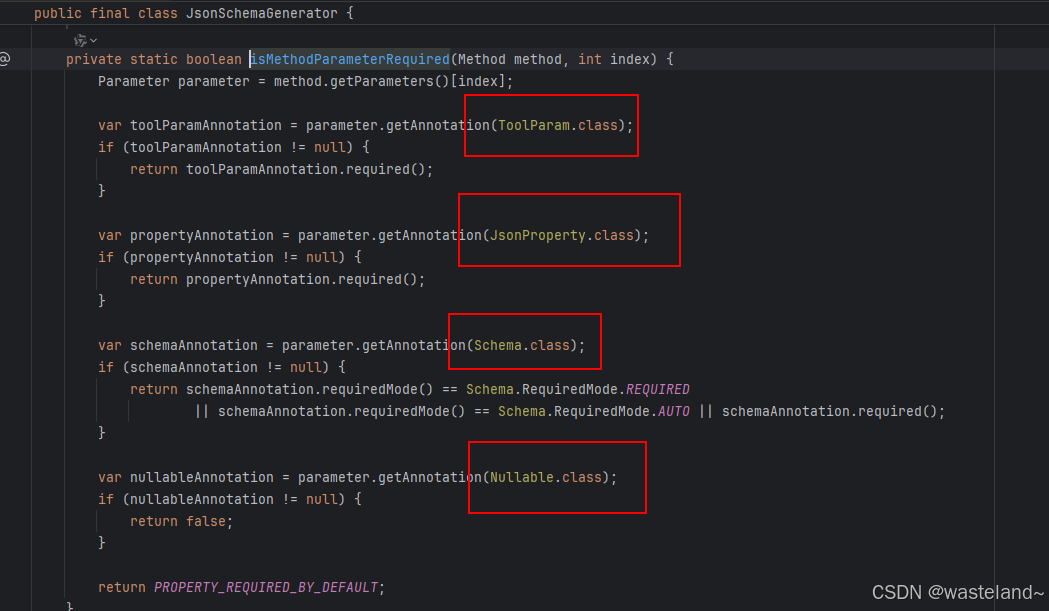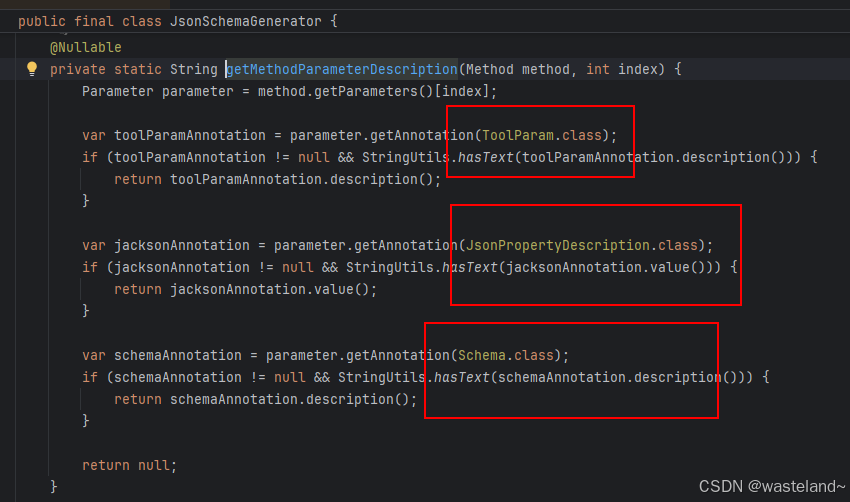 JsonSchemaGenerator 类在底层用于为方法或函数的输入参数生成 JSON 模式,使用方法作为工具和函数作为工具中描述的任何策略。JSON 模式生成逻辑支持一系列注解,您可以在方法和函数的输入参数上使用这些注解来自定义生成的模式。