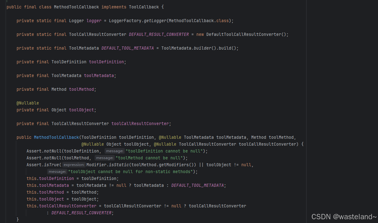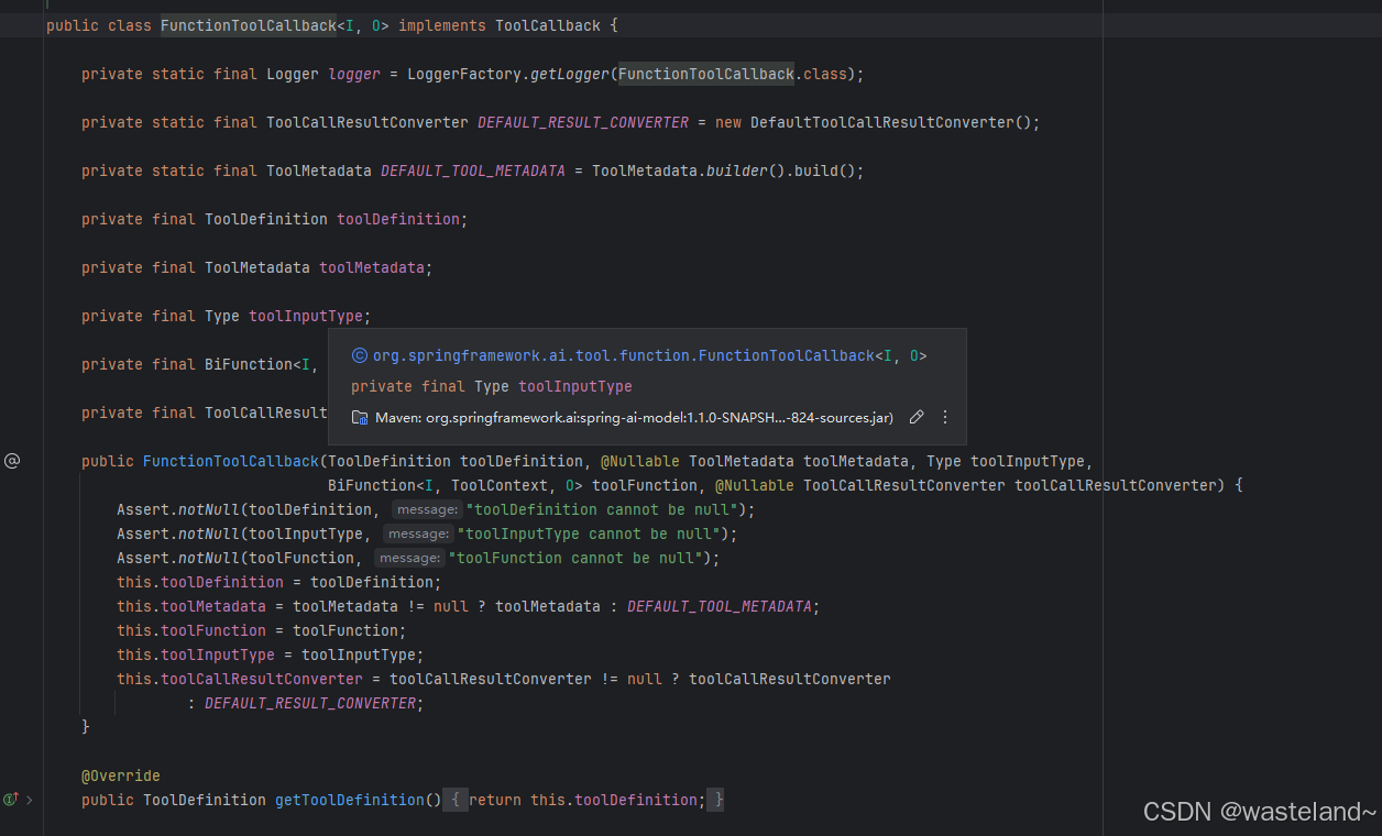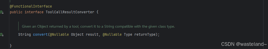 工具调用的结果使用 ToolCallResultConverter 进行序列化,然后发送回 AI 模型。ToolCallResultConverter 接口提供了一种将工具调用结果转换为 String 对象的方法。